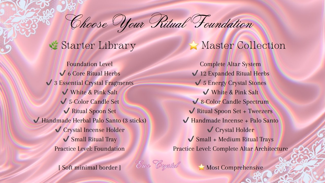 Starter Library vs Master Collection At Eros, ritual is not about performance. It is about structure, intention, and alignment. The Eros Ritual System was created in two distinct layers — allowing you to enter at your own pace, and expand when you are ready. This guide will help you understand the...