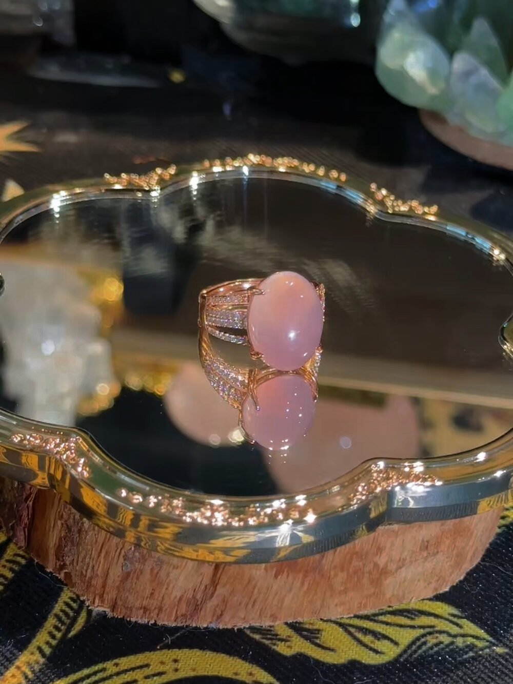 This ring features a smooth pink chalcedony stone with a soft, even tone. Its surface appears gentle and polished, with a quiet, refined presence that feels composed and balanced.