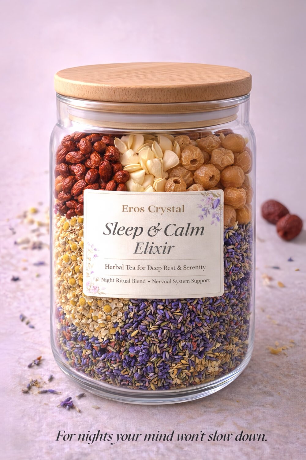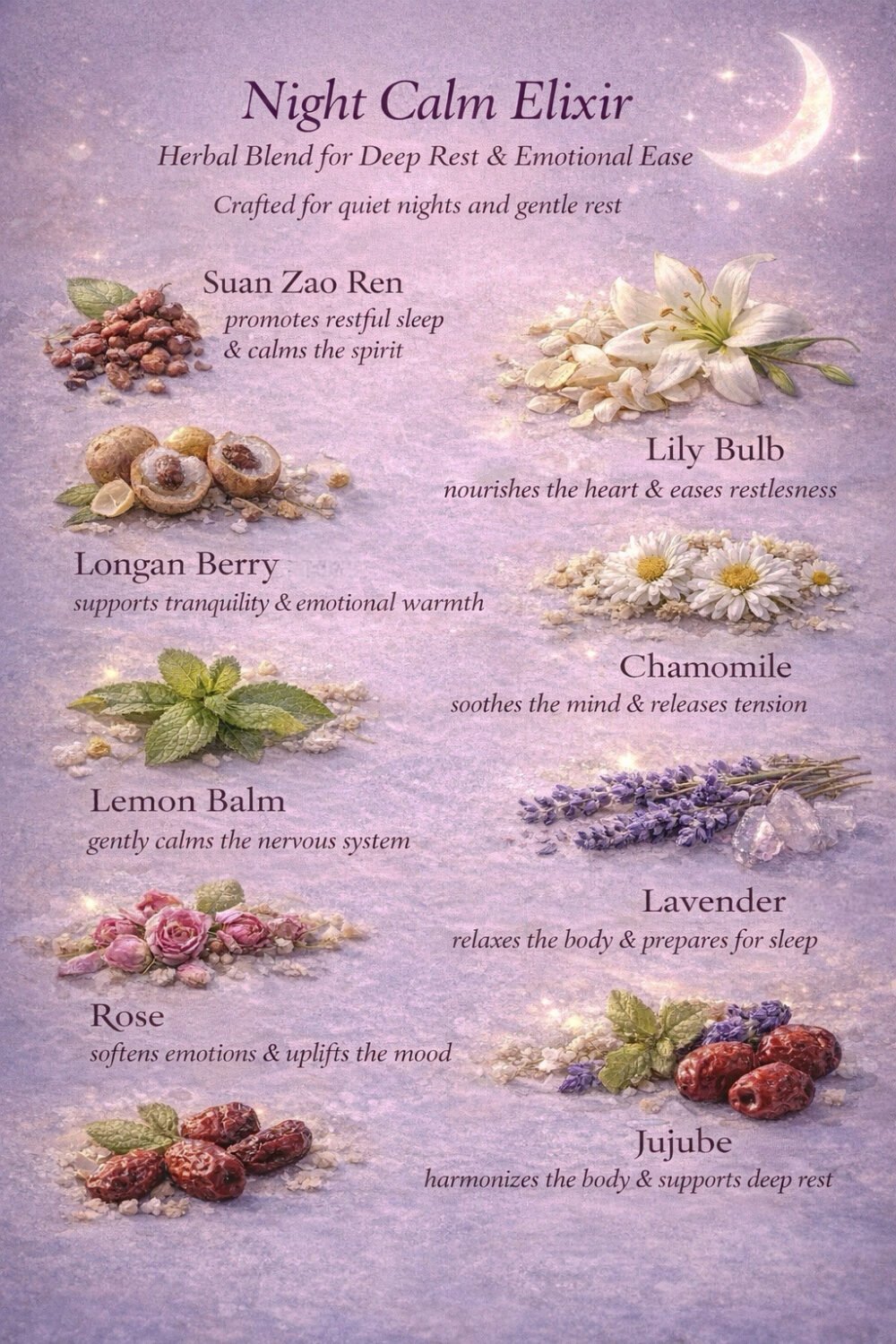 Infused with both Eastern and Western herbal wisdom, this formula works to ease nervous tension, soften emotional buildup, and support your body’s natural transition into rest.